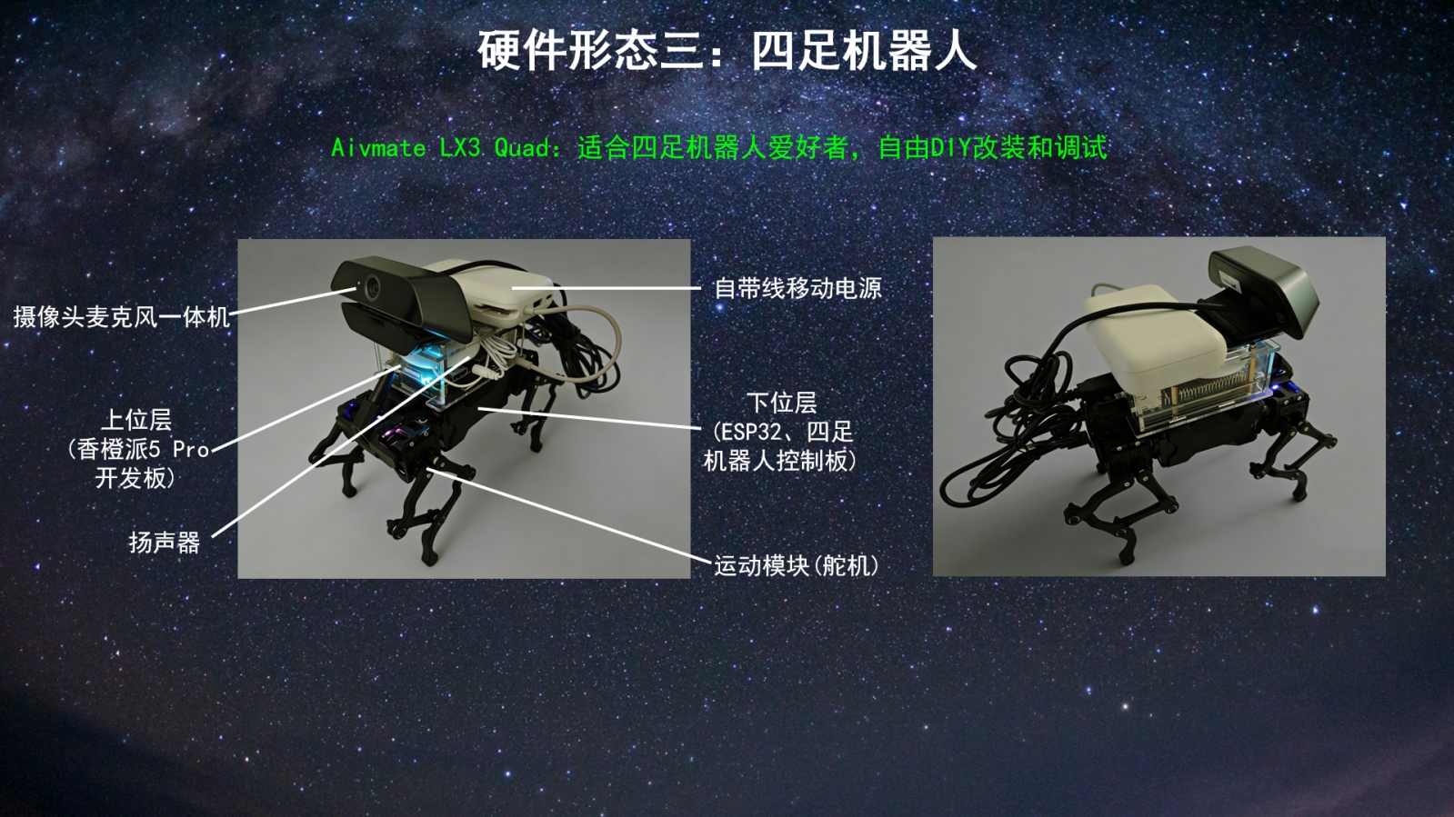 自带模型的整合包(Linux) ↓ 328M(度盘) ↓ (备用夸盘) 使用说明文档 免费获取插件-局域网AI引擎 开源地址 演示视频 迷你小盒形态安装教程 四轮形态安装教程 四足形态安装教程